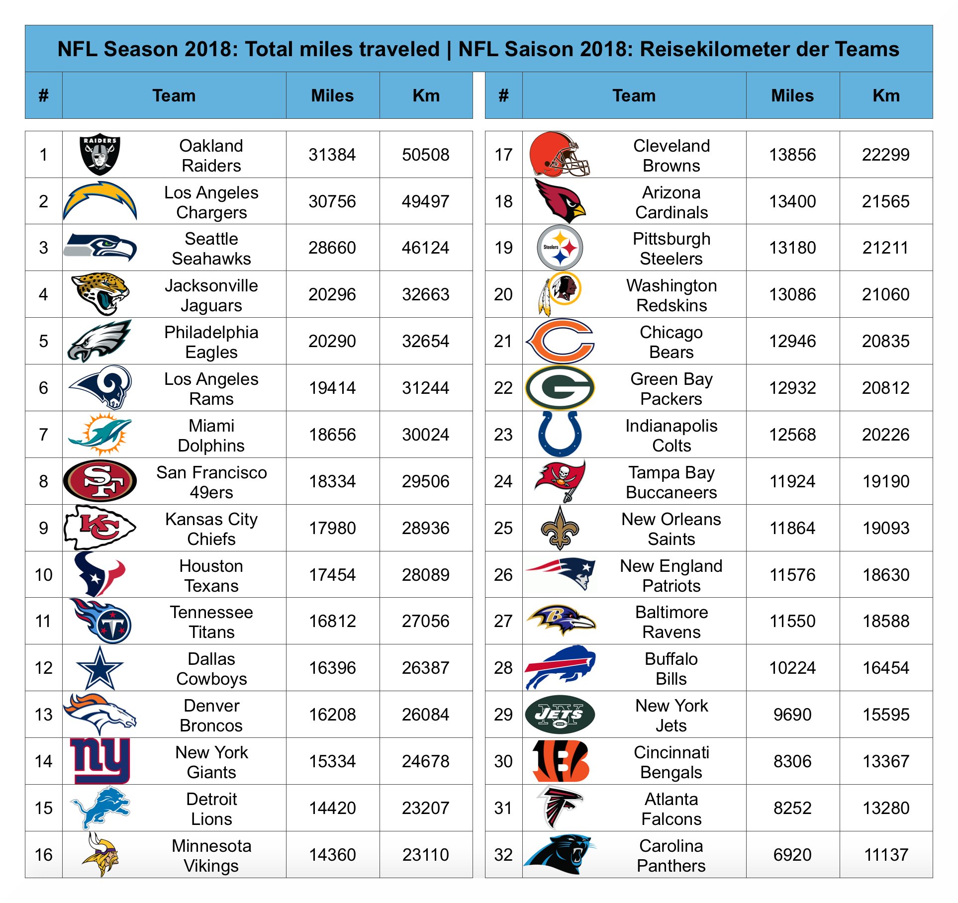 Rene Bugner On Twitter 2018 Nfl Season Total Miles Traveled Die Rangliste Der Reisekilometer Der 32 Nfl Teams Afc West 155025 Km Nfc West 128438 Km Afc South